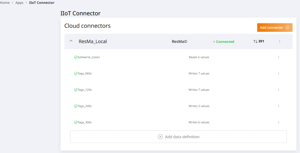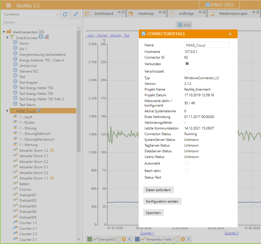 Die Daten werden auf dem ResMa Connector aufgezeichnet und nur zyklisch zum ResMa-Server übertragen. Somit können Sie erst nach Ablauf des eingestellten Zyklus auf die aufgezeichneten Daten zugreifen.