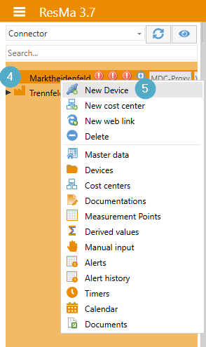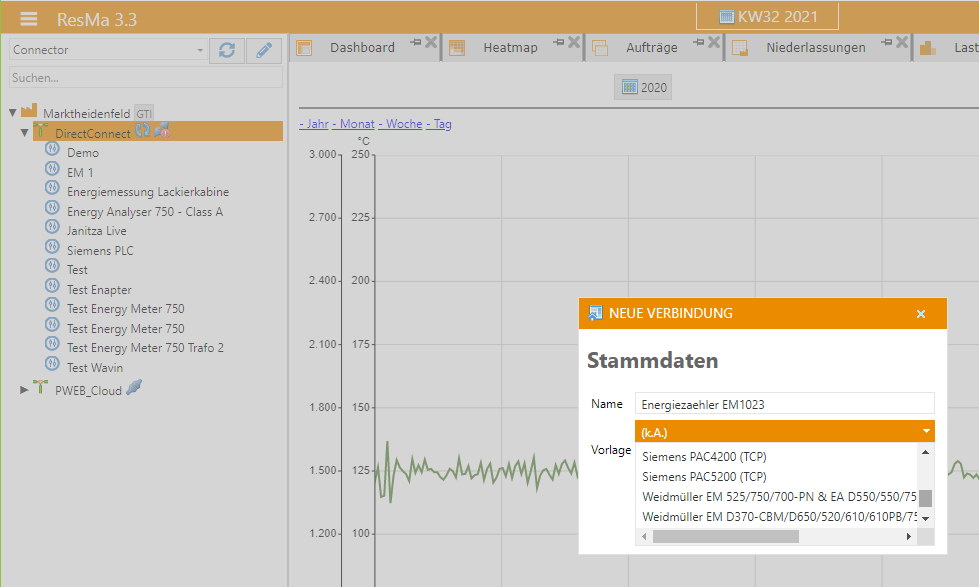 Die Vorlagen können über die ResMa-Ansicht Connector erreicht werden. Über den Editor-Modus kann unter dem aktiven DirectConnector eine Verbindung angelegt werden (Kontextmenü Neue Verbindung). Hier kann aus einer Liste Messgerättypen oder auch native ModBusTCP- oder ModBusRTU-Verbindungen ausgewählt werden.