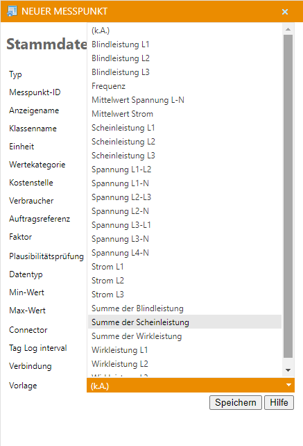 Über das Dropdown-Menü neben Vorlage befindet sich eine große Auswahl der Messgerätevorlagen. Nach der entsprechenden Auswahl müssen im nachfolgenden Fall noch verbindungsspezifische Details eingetragen werden. Diese variieren je nachdem, ob es sich um eine ModBus-TCP- oder ModBus-RTU-Verbindung handelt. Im Falle von ModBus-TCP muss eine Portnummer, die SlaveId des Gerätes und dessen IP-Adresse eingetragen werden. ModBus-RTU muss über folgende Details konfiguriert werden: Parität, SlaveId, StopBits, ComPort und Baudrate. Nachdem die Verbindung konfiguriert wurde, kann unter dieser ein neuer Messpunkte (Kontextmenü Neuer Messpunkt) angelegt werden. Diese Messpunkte können auch aus einer Auswahlliste ausgewählt werden. Die Liste beinhaltet alle Messgrößen, die das in der Verbindung hinterlegte Messgerät zur Verfügung stellt. Auch hier wird dem Benutzer ein Komfortfunktion geboten, um die komplexe Konfiguration von ModBus-Verbindungen zu erleichtern.