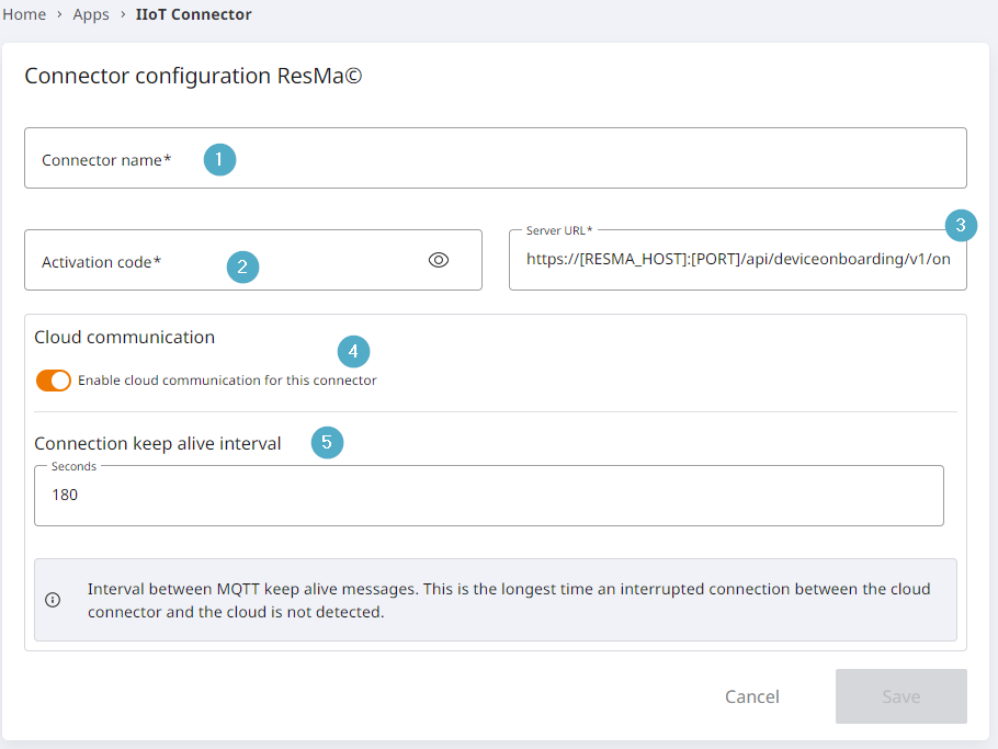 Aktivierungscode: Der Code dient dazu, die Identität des Clients zu bestätigen und den Zugriff auf den MQTT-Broker zu sichern. Der Code muss in ResMa® erzeugt, und hier eingetragen werden. Die Erzeugung des Codes in ResMa® ist nachfolgend im Detail beschrieben.