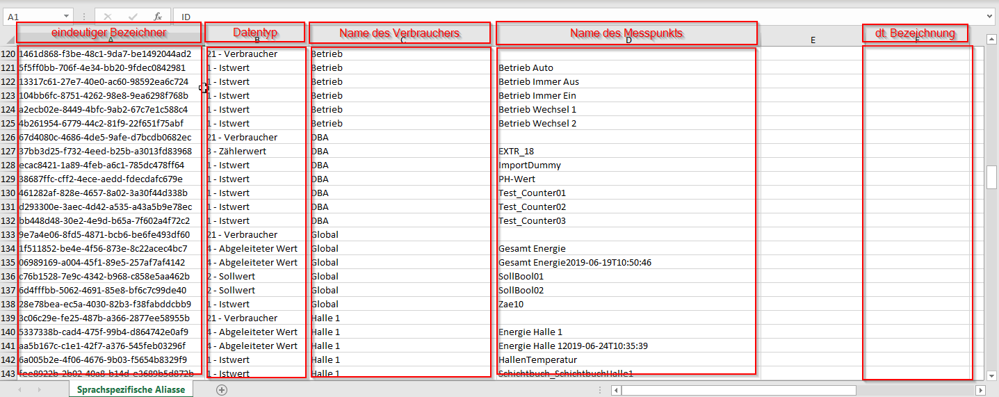 Durch Klicken auf den linken Button, werden die hinterlegten Aliasse als Excel-Datei exportiert. Ein Ausschnitt ist im Folgenden abgebildet: Die erste Spalte ist die systeminterne Id, die zweite Spalte ist der Datentyp des Elements, danach folgt der Name des Verbrauchers und ggf. der Name des Messpunkts. Der Name des Messpunkts ist leer, wenn sich die Zeile auf den Verbraucher bezieht. Die folgenden Spalten enthalten die sprachspezifischen Bezeichnungen. Initial sind sie leer. In der ersten Zeile der Tabelle stehen jeweils die Sprachbezeichnungen für jede Spalte, so dass eine Zuordnung einfach möglich ist.